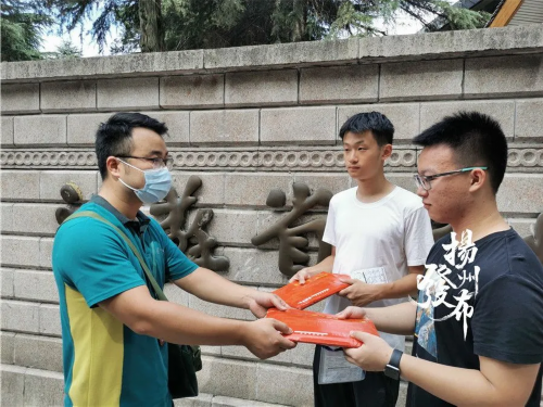 上午9:30,记者跟随扬州邮政特快专递工作人员来到投递地点扬州中学 。武承翰、史开源同学和家长已早早等候在那里。