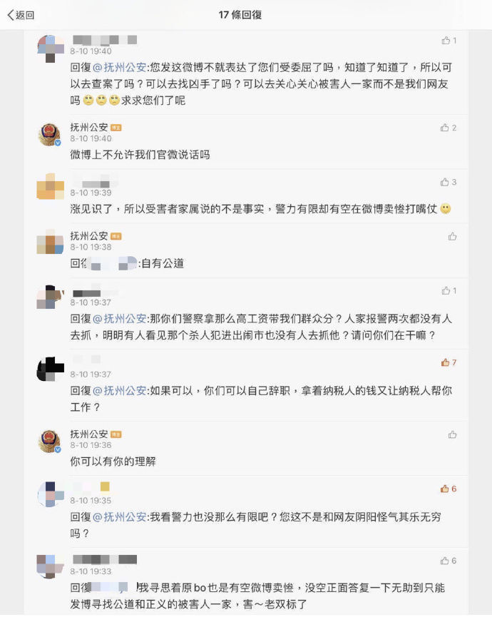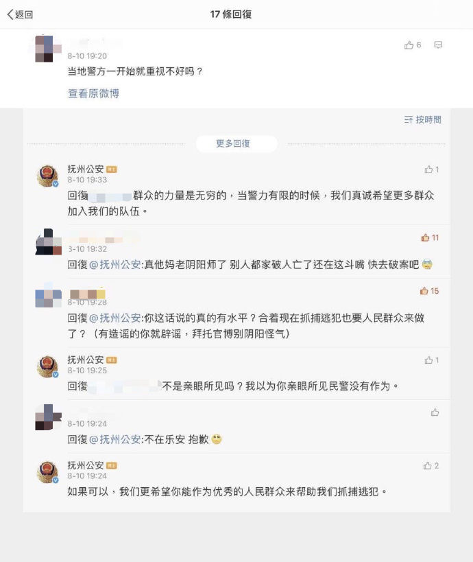 有一说一,政务微博是与群众沟通的桥梁纽带,不应成为“与网友对线”的阵地。在案件未破、当地群众人心惶惶、且此前案件处理流程遭受质疑之时,贸然讲“自有公道”和“希望优秀的人民群众帮助抓捕逃犯”这样的话,可能操作人员一时爽、“有性格”,但有损警方专业性与公众形象。