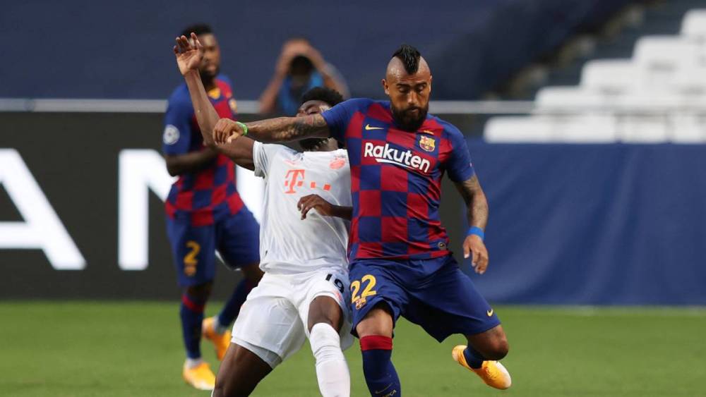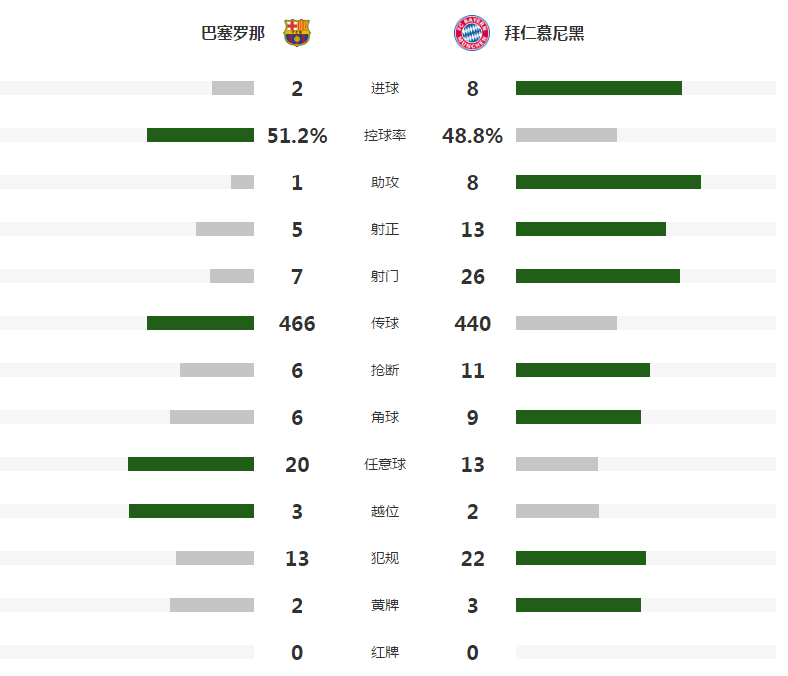 北京时间8月15日凌晨,欧冠1/4决赛中,拜仁8-2大胜巴萨,顺利晋级4强,巴萨近5年内第4次止步欧冠1/4决赛。穆勒梅开二度,格纳布里与基米希传射建功,佩里西奇破门,阿拉巴自摆乌龙一度助巴萨扳平,苏亚雷斯与莱万多夫斯基分别进球,库蒂尼奥反戈旧主连入两球。