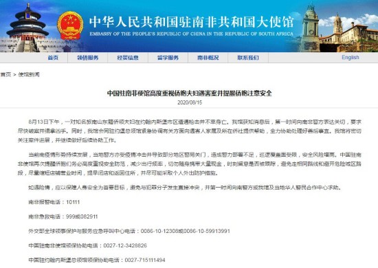 8月13日下午,一对知名旅南山东籍侨领夫妇在约翰内斯堡市区遭遇枪击并不幸身亡。我馆获知消息后,第一时间向南非警方表达关切,要求尽快破案并缉拿凶手。同时,我馆会同驻约堡总领馆紧急协调有关方面向遇害人家属及所在侨社提供帮助,全力协助处理好善后事宜。我馆将密切关注案件进展,并继续做好后续协助工作。