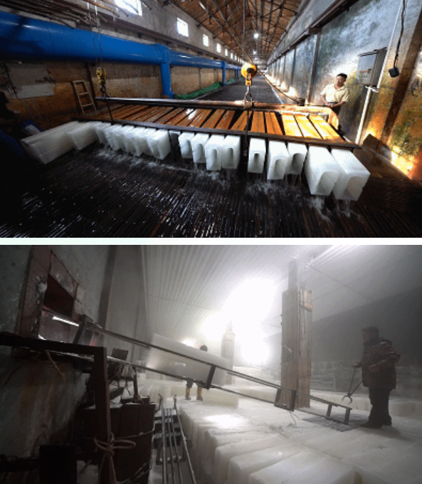 “埋”在冰池里的200只冰桶被逐排提起,在零下20℃的池子里,历经8~10小时的冷却,桶里的水全部结成了坚硬的冰。吊出的冰桶,放在常温水里冲洗几次,冰条就脱落了下来,一根50公斤,一排20根,一池冰全部起出有100吨。