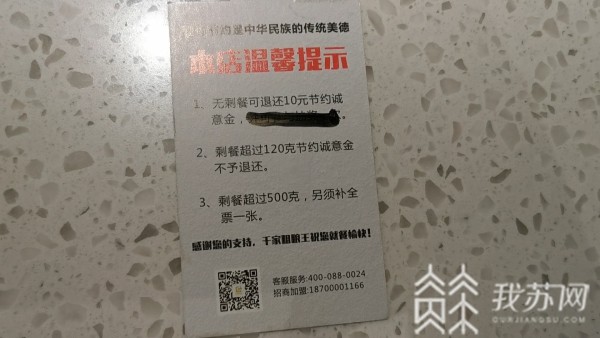 在进入餐厅之后,记者发现在每张餐桌上都摆放着一张节约粮食的提示卡。上面也做了一个解释:如果没有剩餐,可以退还10元的节约诚意金;如果剩餐超过120克,节约诚意金将不予以退还;如果剩餐超过500克,另外需补全票一张。
