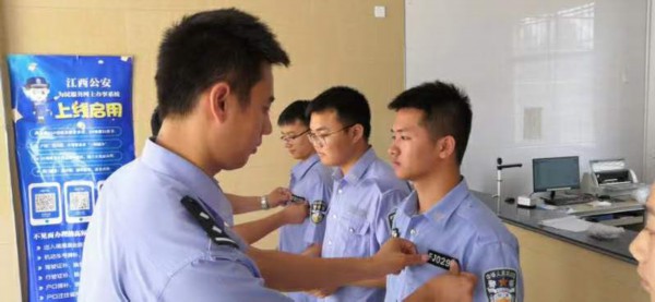 今年3月,被招录为辅警的杜海华(右一)。