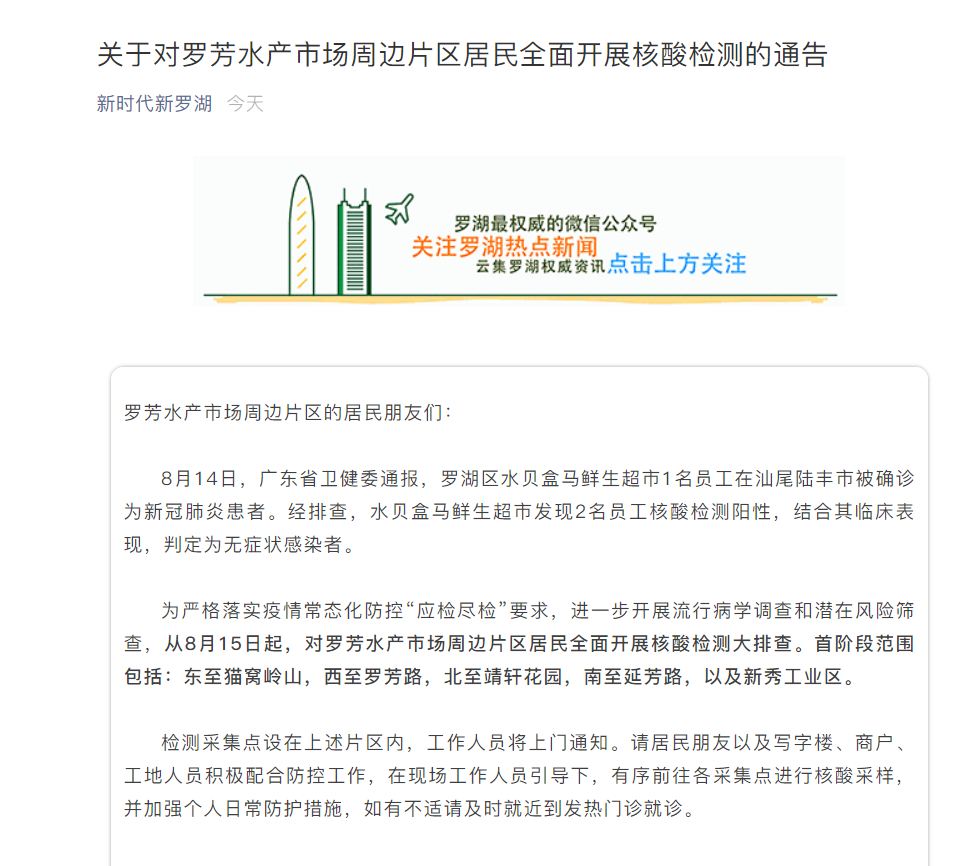 荔枝新闻讯 深圳罗湖宣传部官方微信号8月16日援引罗湖区新冠病毒肺炎疫情防控指挥部办公室消息,8月14日,广东省卫健委通报,罗湖区水贝盒马鲜生超市1名员工在汕尾陆丰市被确诊为新冠肺炎患者。经排查,水贝盒马鲜生超市发现2名员工核酸检测阳性,结合其临床表现,判定为无症状感染者。