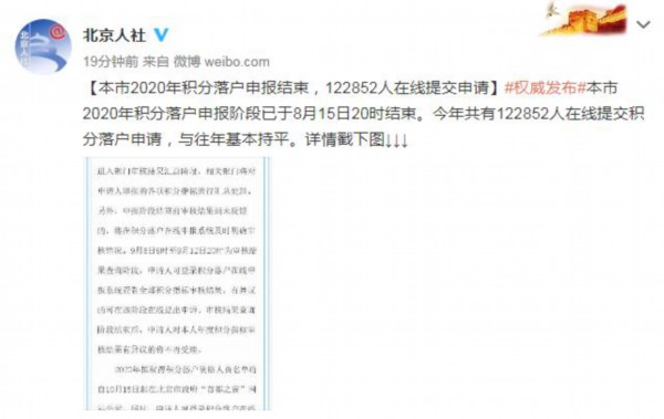 中新经纬客户端8月16日电 16日,北京市人力资源和社会保障局发布消息,北京市2020年积分落户申报阶段已于8月15日20时结束。今年共有122852人在线提交积分落户申请,与往年基本持平。