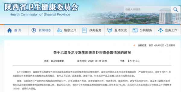8月13日,陕西省疾控中心报告称在对西安市莲湖区方欣海鲜市场海鲜产品采样核酸检测中,发现一个批次的进口厄瓜多尔冻白虾外包装新冠病毒核酸检测结果呈阳性。