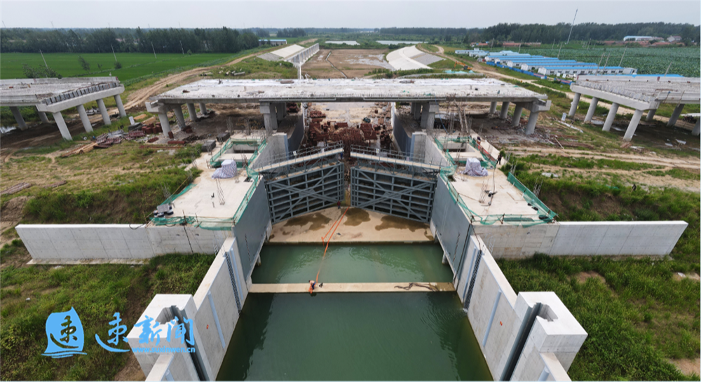 8月15日, 江苏省宿连航道先导段宿迁陆运河船闸工程施工现场,工人们正在加紧施工。