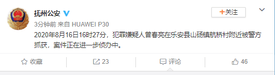 2020年8月16日16时27分,犯罪嫌疑人曾春亮在乐安县山砀镇航桥村附近被警方抓获,案件正在进一步侦办中。