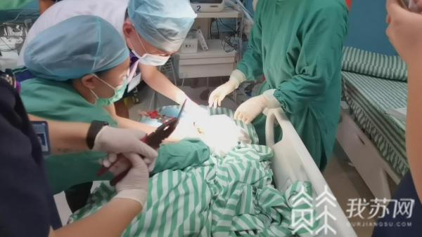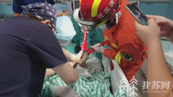 救援人员到达现场,了解到是一个20个月大小男孩,头左边插了一个修脚的钢片(钢片大约在15cm),现场医务人员将小男孩受伤的脑部CT给消防救援人员观看,并告诉消防救援人员在施救过程中应该注意事项,随后消防救援人员立即对作业的大力钳进行消毒杀菌,在与医务人员沟通之后,救援人员利用大力钳将裸露在头部以外的修脚钢片剪断,随后将男孩送往手术室进行手术。