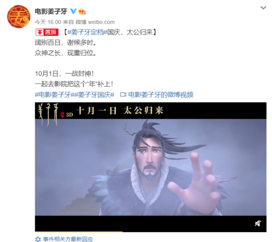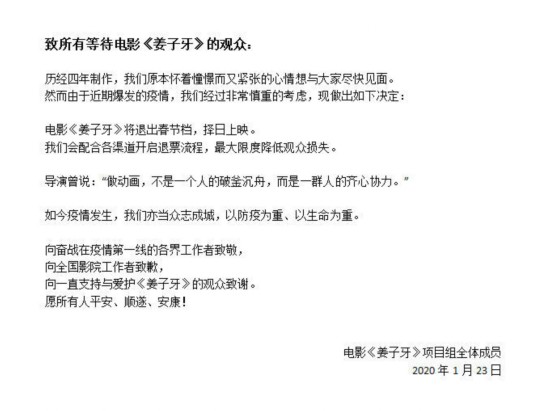 受疫情影响,1月23日,官方宣布《姜子牙》退出春节档,择日上映。