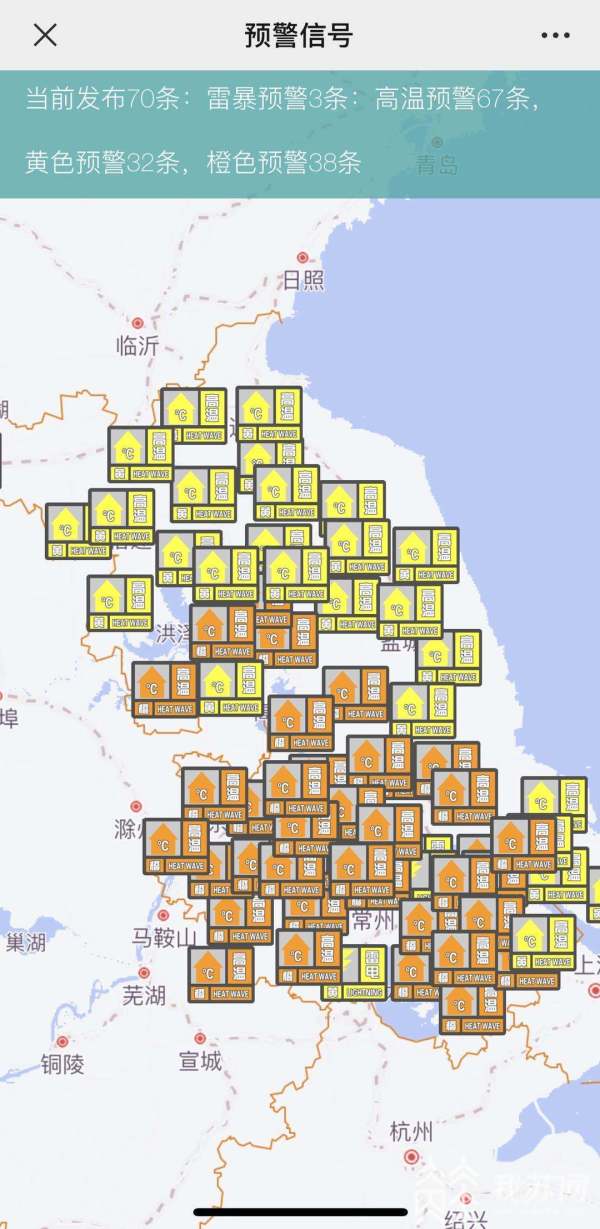 截至8月16号下午4点半,全省共发布70条预警,其中雷暴预警3条,橙色预警达38条,沿江苏南都被橙色预警包围。江苏省气象台首席预报员吴海英说:“南京、扬州、泰州、苏锡常这一带,还有南通的个别站点气温达到37度以上。”