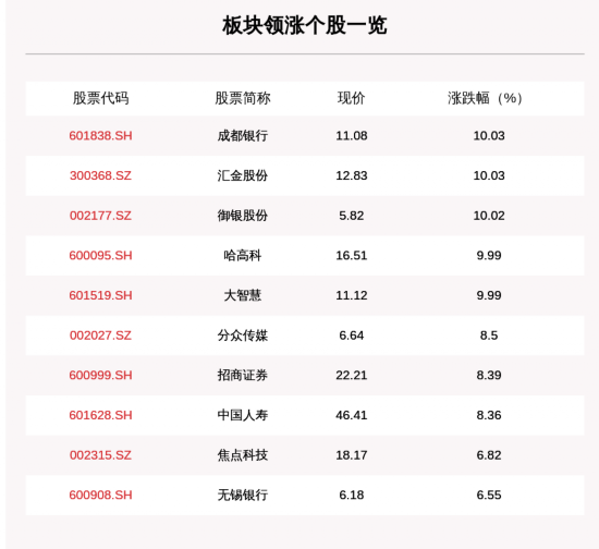 每经AI快讯,大金融板块走强,板块内196只上涨,6只平盘,26只下跌,成都银行、汇金股份、御银股份分别涨10.03%、10.03%、10.02%。
