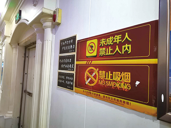 紧接着,联合执法人员又相继对解放东路、通灌南路以及盐河巷几家酒吧和KTV进行了突击检查,发现这些娱乐场所虽然也在入口或是店堂显眼位置张贴了“禁止18岁以下未成年入内”的标志牌,但却大多数形同虚设:不仅接纳未成年进入,还向未成年人出售烟酒、雇佣未成年人,有的还存在有偿陪酒等违法违规行为。在解放东路一家KTV里,一名来自沭阳的陪酒女孩只有15岁;盐河巷一家酒吧里,两名正在喝酒抽烟的男孩分别是15岁和16岁,还有几名初三刚毕业的女孩和几名高三毕业的男生正在玩耍,最小的女孩只有15周岁……