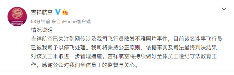 吉祥航空已关注到网传涉及我司飞行员散发不雅照片事件,目前该名涉事飞行员已被我司予以停飞处理。我司将秉持公正原则,依据事实及司法最终判决结果,对该员工釆取进一步管理措施。吉祥航空将持续做好全体员工遵纪守法教育工作,感谢公众对我们全体员工的监督与关心。