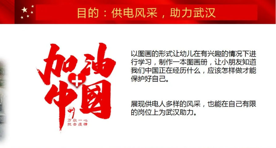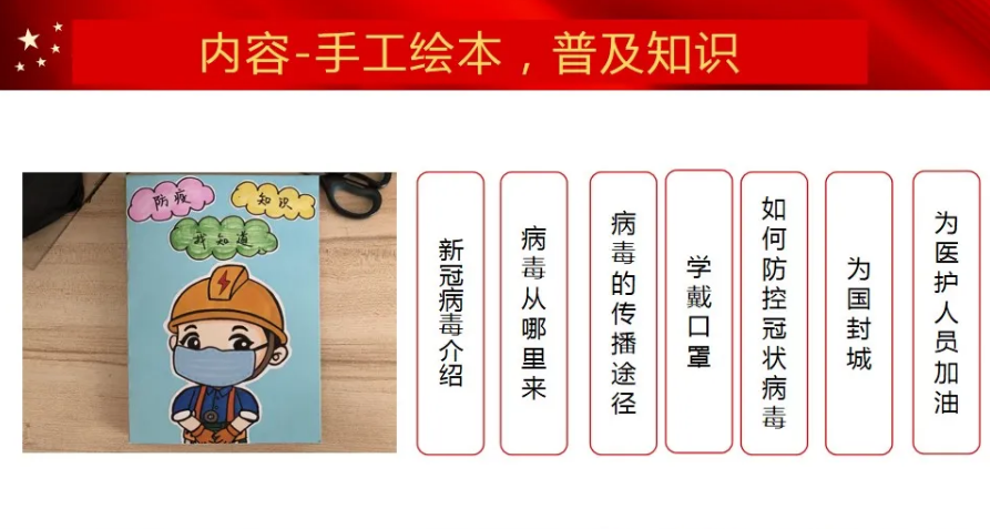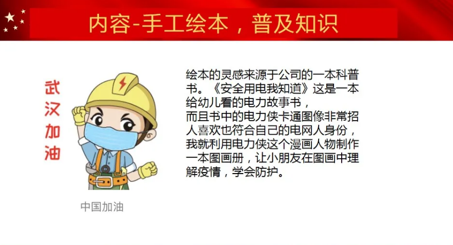 绘本的灵感来自于公司的一篇电力安全科普书,我用了其中“电力侠”的形象。整个绘本共分为七个板块,分别介绍了病毒的形象、病毒的来源、病毒的传播途径、预防病毒的方法和措施,以及疫情期间的各项重大举措:为一国封一城、逆行的医护人员,各地区的物资支持。这里我做了一个巧妙的设计,让四辆小车可以拉动,体现一种八方支援的感觉,让小朋友们感受到全国团结一心的力量。最后为医护人员加油,向她们道一声辛苦了!也是给小朋友树立了榜样。