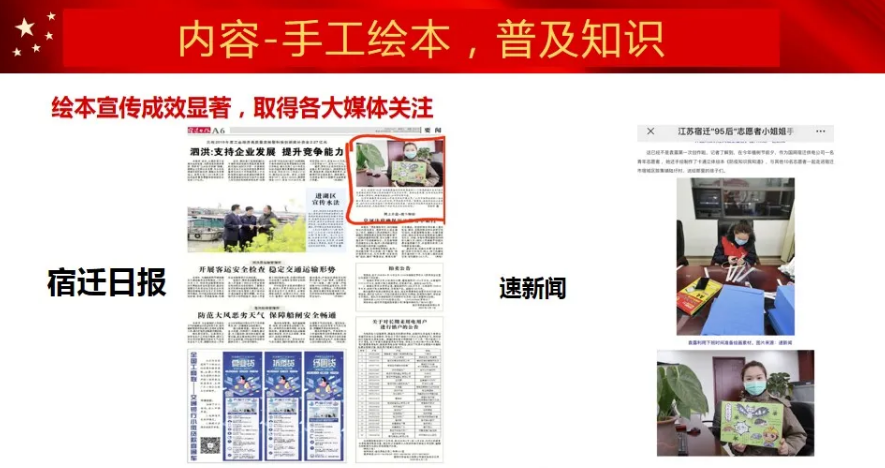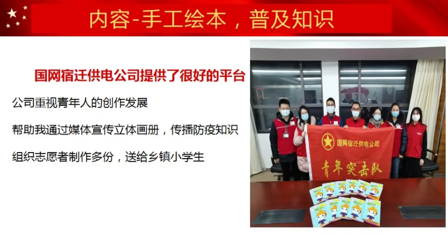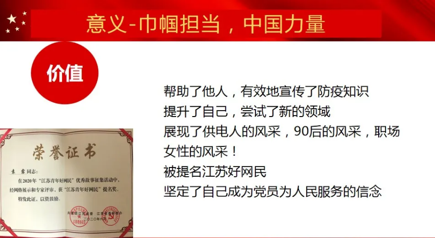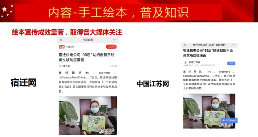 绘本完成后,我们制作了许多本送给乡镇的小朋友,得到了小朋友们的欢迎,更是被电网头条、现代快报等媒体进行宣传转载。不久之后国外的疫情也出现了爆发,于是我分别制作了中文和英文版本的防疫漫画视频,向国内外网友宣传防疫知识,获得了许多好评,江苏省为我授予了“江苏好网民”称号。这次经历让我更加坚定自己成为党员并为人民服务的信念,在未来的时间中,我会更加积极的展示供电人的风采,职场女性的风采,90后的风采!