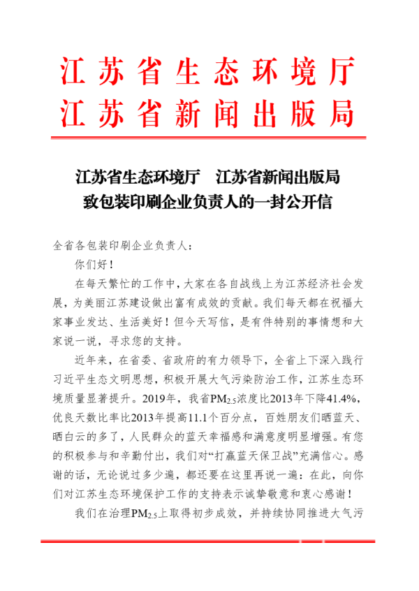 为积极应对夏季臭氧污染,日前,江苏省生态环境厅、江苏省新闻出版局联合致信全省包装印刷企业负责人。