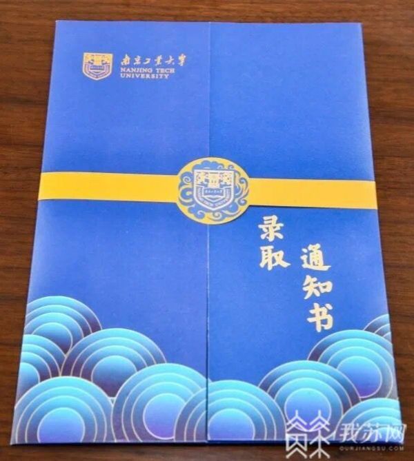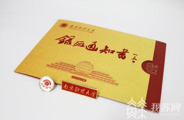 由南京工业大学设计学院学生设计的录取通知书,其灵感来自于"南京云锦"。封皮参考传统"补服"的理念,中心正面的"补子"部分,是南京工业大学的校徽结合传统纹样。抽出内页在标志性建筑天宝阁前望远,犹若清风拂面。