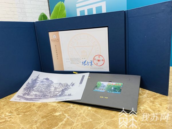 打开东大蓝的封套,《临江仙》的校歌,悠扬响起。跃入眼帘的是齐康院士所作的钢笔画,曾创造中国建筑奇迹的大礼堂,自1931年起与学校共同经历了八十多年的风雨,也是《建国大业》等影视作品取景地。录取通知礼盒中放置了纪念卡片、纪念邮票等作为给2020级新生的见面礼,在礼盒的最后一层,烫金文字刻画了东南大学的历史变迁。