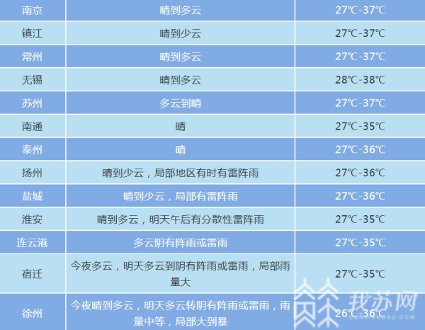 今天夜里,全省晴到多云。明天江淮之间北部和淮北局部有雷阵雨,其中淮北雨量中等,局部大到暴雨。