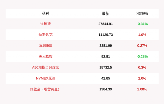 富时中国A50指数期货上涨47.5点,涨幅为0.3%,报15732.5点;NYMEX原油收盘上涨0.84点,涨幅为2.0%,报42.85点;美元指数收盘下跌0.26点,跌幅为0.28%,报92.81点;伦敦金(现货黄金)收盘上涨40.5点,涨幅为2.08%,报1984.39点。