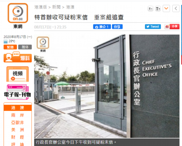 【港媒:特首办收到装有白色粉末信件 重案组正追查】