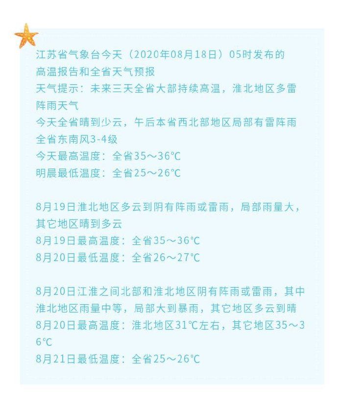 今天全省晴到少云,午后本省西北部地区局部有雷阵雨。全省东南风3-4级。今天最高温度:全省35~36℃。明晨最低温度:全省25~26℃。
