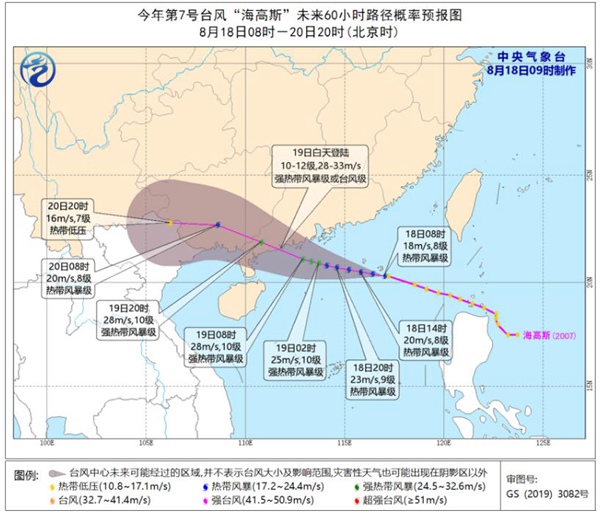 中央气象台预计,台风将以每小时22公里左右的速度向偏西方向移动,强度继续加强,并将于19日中午到晚上在广东阳江到徐闻一带沿海登陆(28~33米/秒,10~12级,强热带风暴级或台风级),登陆以后向偏西方向移动,强度逐渐减弱。