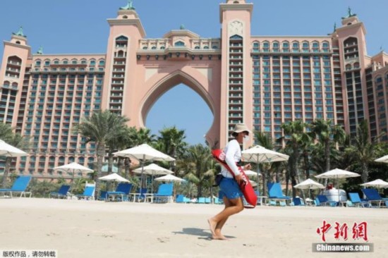 当地时间7月7日,迪拜重新向海外旅客开放,持阿联酋有效签证的外国旅客即日起即可入境。图为迪拜地标建筑五星级棕榈岛亚特兰蒂斯酒店重新开放。