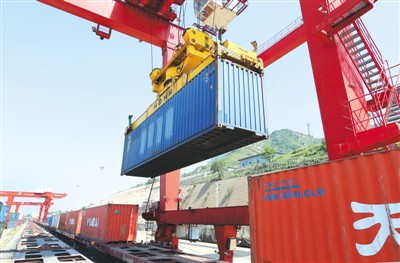 中哈(连云港)物流合作基地是江苏连云港自贸区港口区块里的一张亮丽名片。截至今年5月中旬,该基地今年到发中欧班列突破1万车。图为大型机械正在吊装集装箱。