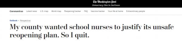 △《华盛顿邮报》刊登护士自述:“我所在县的学校要求护士为不安全的重开计划辩护。我不干了。”