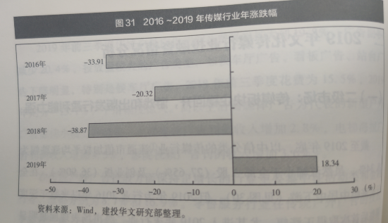 2019年是传媒行业自2016年以来,数年深度调整后首次取得正涨幅。从2016年到2019年,该行业涨跌幅分别为:-33.91%、-20.32%、-38.87%和18.34%。