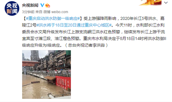 受上游强降雨影响,2020年长江5号洪水、嘉陵江2号洪水将于18日至20日通过重庆中心城区。今天11时,水利部长江水利委员会水文局升级发布长江上游支流岷江洪水红色预警,继续发布长江上游干流宜宾至寸滩江段、涪江橙色预警。重庆市水利局决定于8月18日14时将洪水防御II级响应升级为I级响应。(总台央视记者李洪淼)