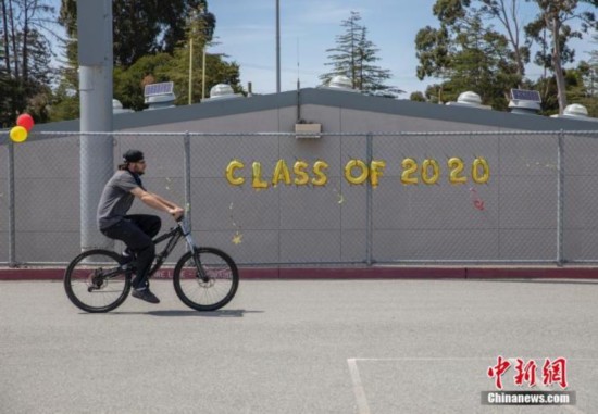 资料图:当地时间5月15日,美国北加州圣马特奥县的米尔斯高中迎来特殊毕业季,毕业生们开车或乘车来到学校工作人员布置的不同站点,完成还书、缴费以及领取毕业物品等环节。 中新社记者 刘关关 摄