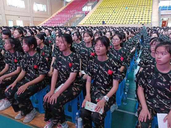 市红会培训老师沈云霞、王宇在体育馆举办了一场应急救护知识培训,正在接受军训的15个班级780名高一新生参加听讲。