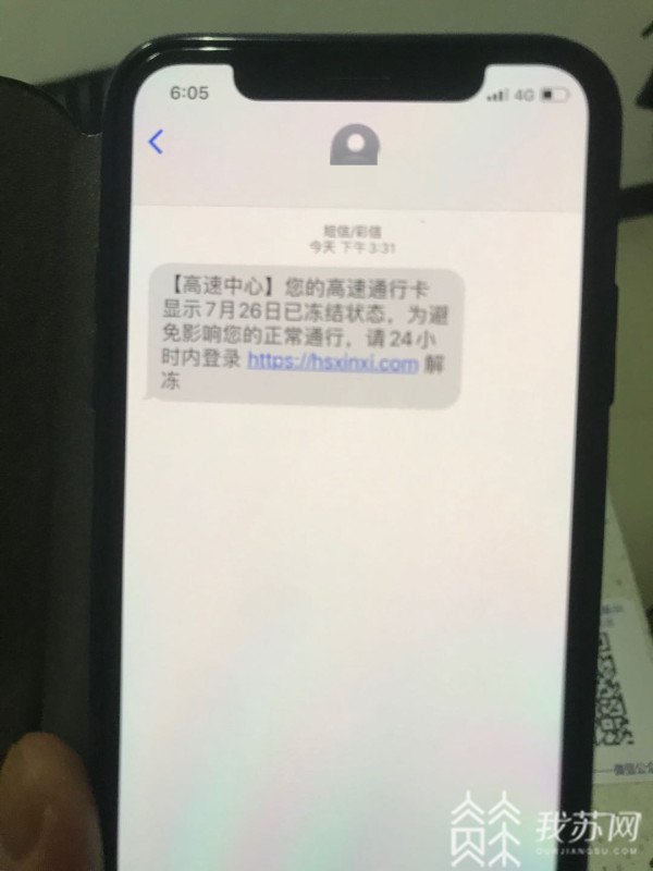 据介绍,当天下午,他和妻子两人开车在从扬州回南京的高速上,突然收到一条号称高速中心的短信,提示称王先生的高速ETC通行卡已经被冻结,为避免影响正常通行,需要点击短信上的链接来解冻。起初,王先生也没在意,但是在经过ETC时刚好ETC的杆子没有及时抬起,王先生以为高速卡确实存在问题,便让妻子在一旁赶快按照短信上的提示进行操作。