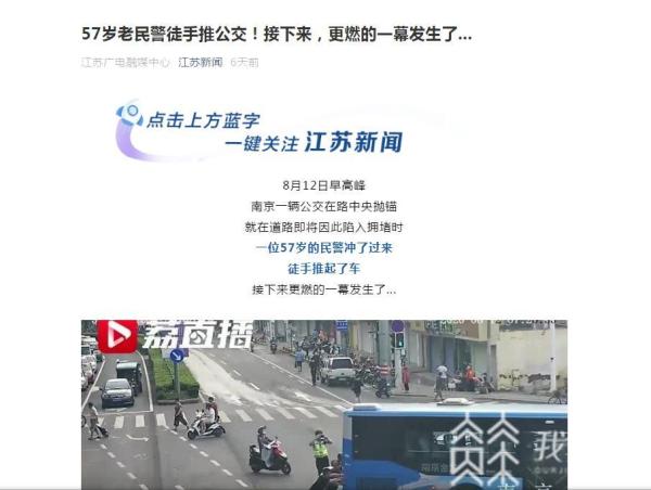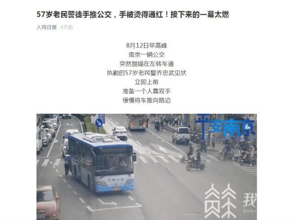 8月12日早高峰,南京一辆公交车在路中央抛锚,眼看道路即将因此陷入拥堵,57岁执勤交警乔忠武冲上前,徒手推起了车。20米上坡路,公交车爬坡异常艰难,乔忠武推了十几分钟,双手被高温车身烫得通红。此时几名路人见状赶来帮忙,20分钟后,公交车被顺利挪到路边。这个早高峰,该路段没有出现任何拥堵。