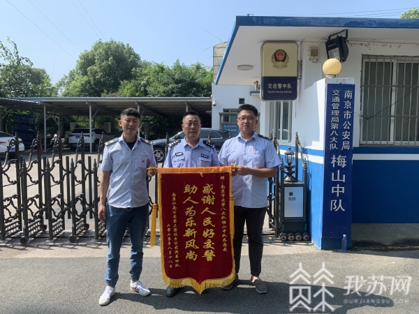 今天(8月18号)上午9:40,那天被帮助的南京158路公交车驾驶员李亮和车队代表,闻讯找到了老乔所在的交警大队,专门给乔忠武送来锦旗。