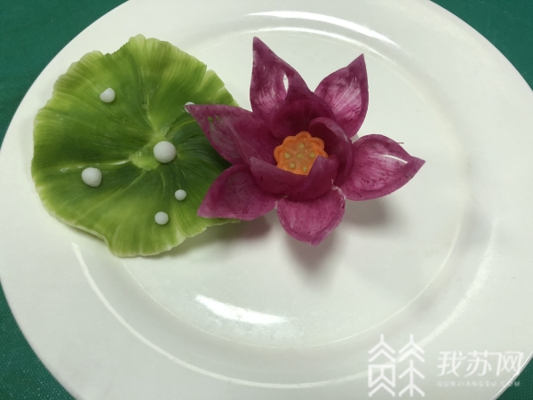 张佳明是江苏旅游职业学院烹饪专业的大三学生,暑假里,正在备战全国职业院校技能大赛。一块紫心萝卜,一片萝卜皮,在他手中也能瞬间秒变夏日的荷花。“用了传统精细的刀工做了荷花,用了青皮萝卜做了荷叶,在精心的刀工基础上体现池塘里的一些元素。”