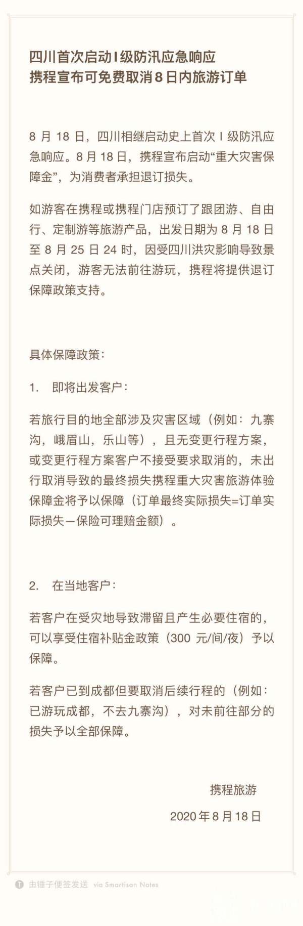 据携程公告称,如游客在携程或携程门店预订了跟团游、自由行、定制游等旅游产品,出发日期为8月18日至8月25日24时,因受四川洪灾影响导致景点关闭,游客无法前往游玩,携程将提供退订保障政策支持。