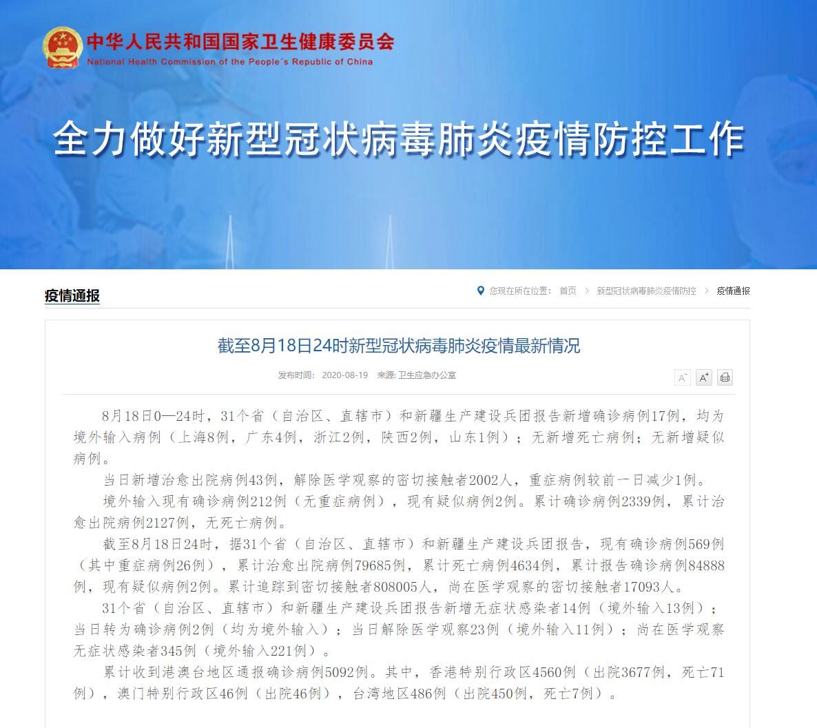 截至8月18日24时,据31个省(自治区、直辖市)和新疆生产建设兵团报告,现有确诊病例569例(其中重症病例26例),累计治愈出院病例79685例,累计死亡病例4634例,累计报告确诊病例84888例,现有疑似病例2例。累计追踪到密切接触者808005人,尚在医学观察的密切接触者17093人。