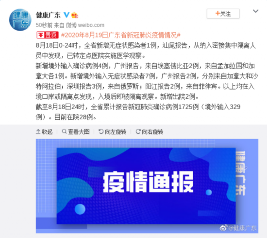 荔枝新闻讯 据广东卫健委官方微博消息,8月18日0-24时,广东省新增无症状感染者1例,汕尾报告,从纳入密接集中隔离人员中发现,已转定点医院实施医学观察。