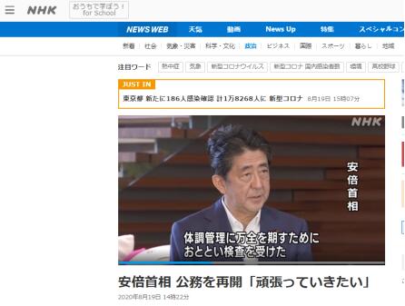 据日本广播公司(NHK)19日报道,安倍于当地时间当天下午13时30分左右进入了首相官邸,重新开始工作。报道称,进入首相官邸后,有记者询问安倍目前的身体情况,安倍回答说:“为了确保身体状况万无一失,我在前天接受了体检。我想从现在开始重返工作岗位,继续努力工作。”