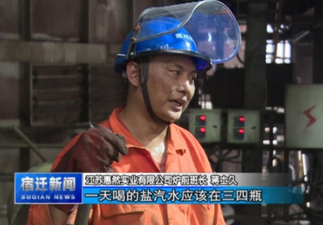 江苏惠然实业有限公司炉前班长 蒋士久:“一天喝的盐汽水应该在三四瓶,不喝受不了,太渴了,流汗太多了,一般的情况下一个班难得上一次厕所,排汗都排掉了。”