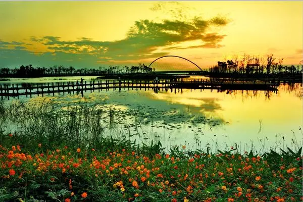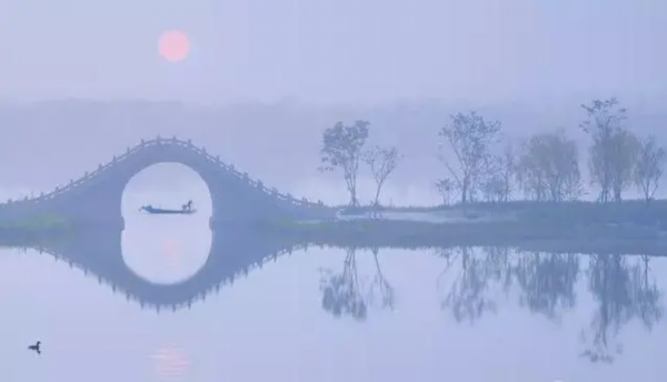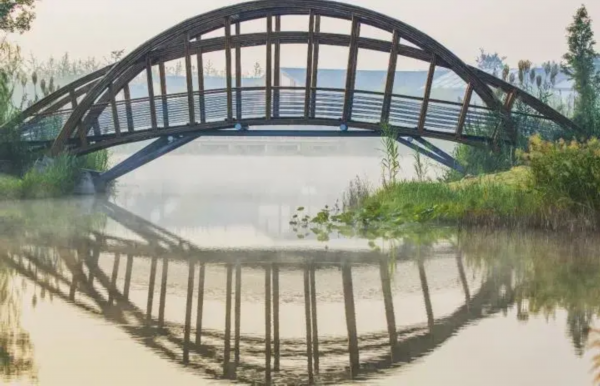 罗曼桥位于骆马湖畔的罗曼园内,夕阳下、微风中,湖面上桥身的倒影犹如波动的琴弦,清风拂过,好似能欣赏到大自然的天籁乐音。黄昏时分,霞光洒落,罗曼桥与周围的灵动水景映衬在一起,好似一幅浓墨重彩的油画。