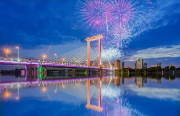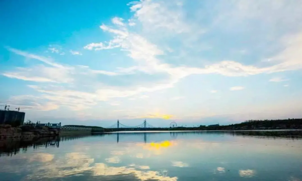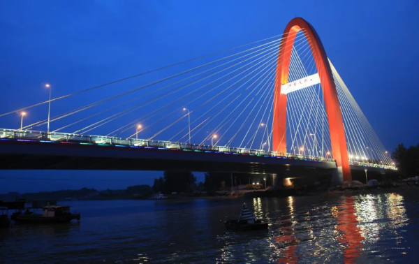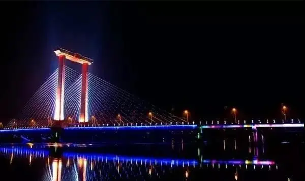位于沭阳县南部新城的景观河上,桥面较宽阔。桥上设装饰性悬索,包含主缆、吊杆和桥塔。雄伟的桥身映在清澈的河面上,宛如长虹卧波。夜晚,大桥的霓虹灯与南湖公园的摩天轮交相辉映,美得令人惊叹!