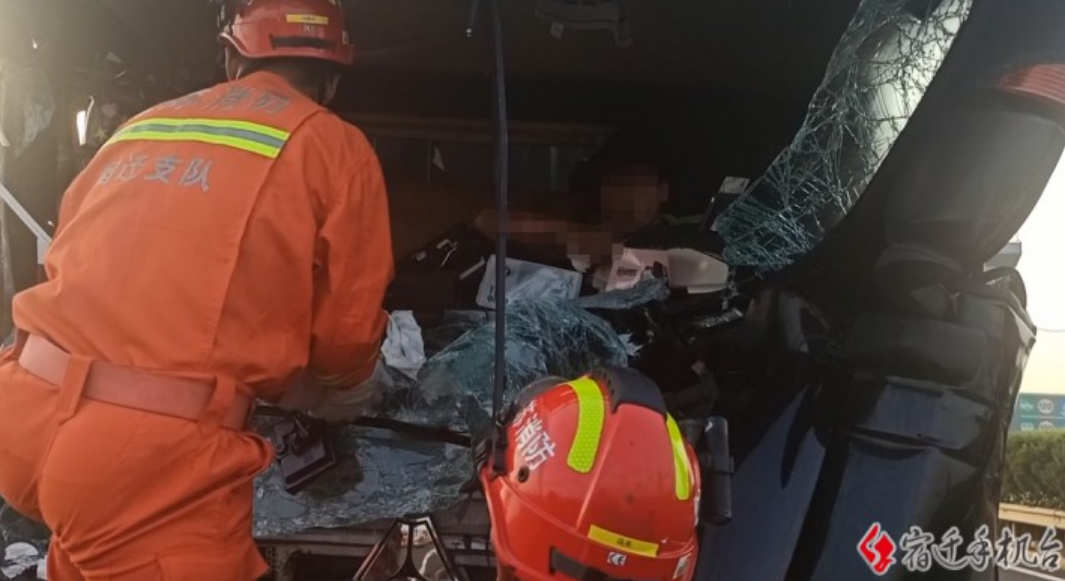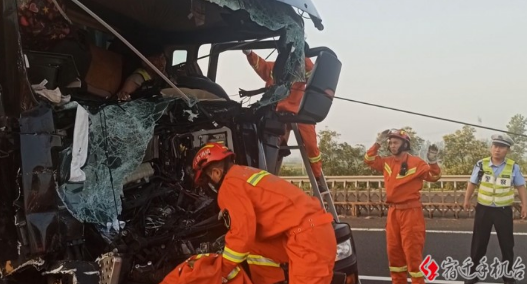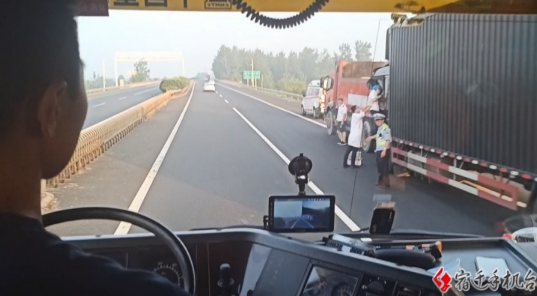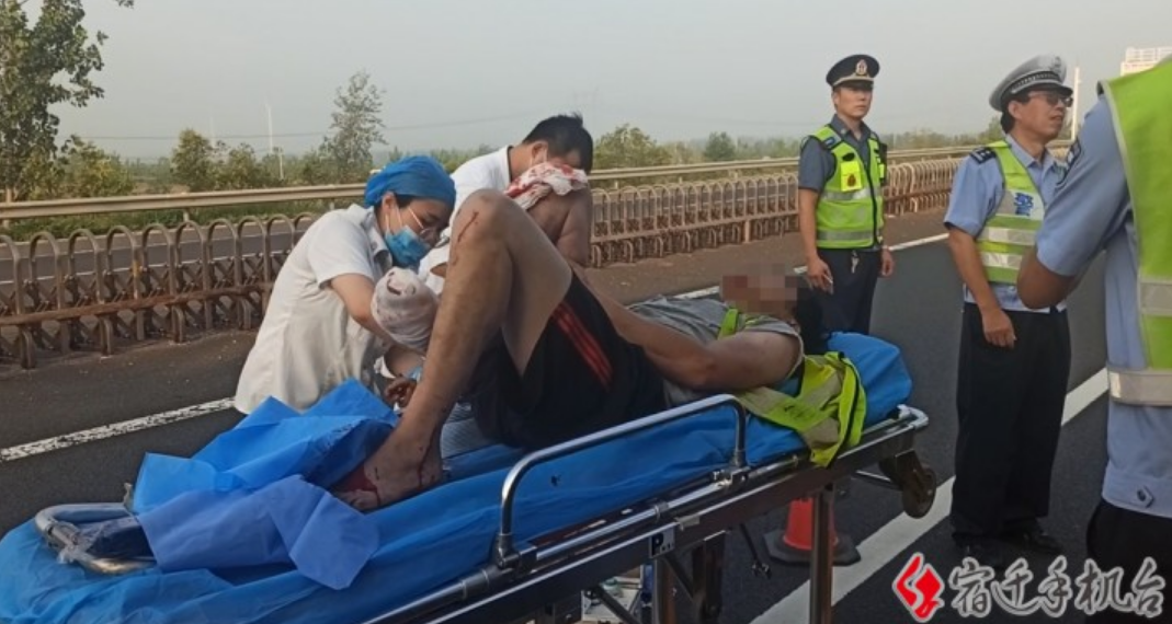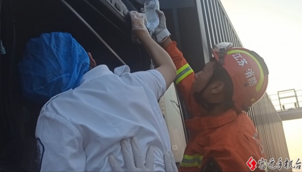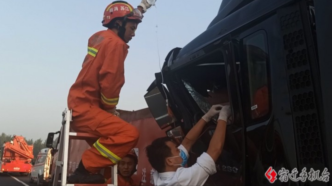 8月18日早上五点多,在徐淮高速成子湖大桥附近发生一起交通事故。一名驾驶人员被困驾驶室,面部流血加上天气高温,驾驶员极度虚脱,情况十分紧急。
