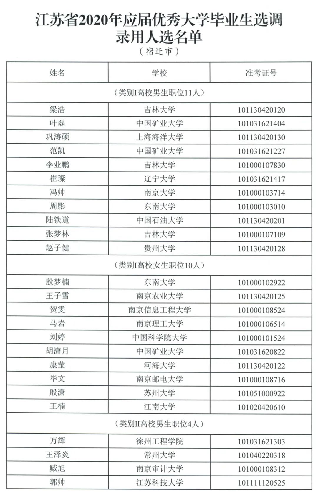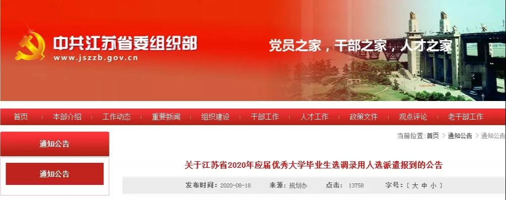 根据《江苏省2020年应届优秀大学毕业生选调工作公告》,经组织推荐、资格审核、笔试、面试、公示、考察、体检等程序,确定484名选调录用人选(名单已发至各设区市及有关高校),另有1人未完成体检。请录用人选及时与所在高校联系,办理派遣手续,于2020年8月21日携带本人就业报到证、毕业证、学位证,到选调职位所在设区市委组织部规划办报到。党组织关系、个人档案(请注明选调生档案)转递到选调职位所在设区市委组织部。