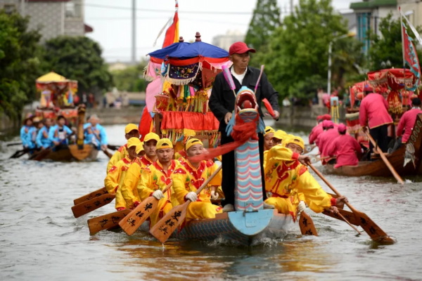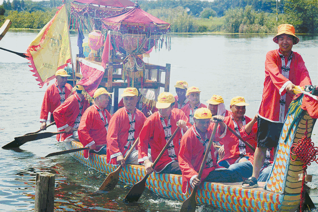 大湖甸龙舟赛:社庙延请堂名班吹打十番锣鼓,鼓乐喧嚣,各队划着龙舟到庙前集合。船的样式,沿袭宋朝时,两头高翘,船上双层旗架扎着各色旗伞。
