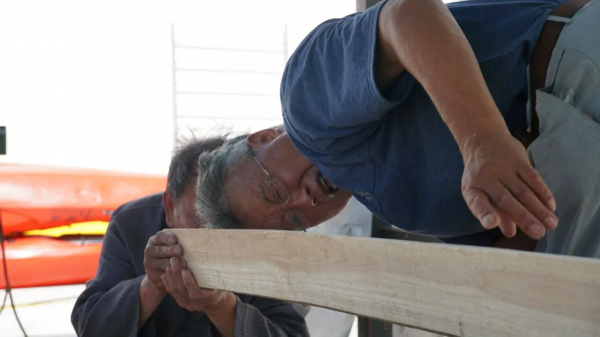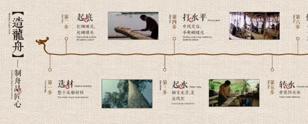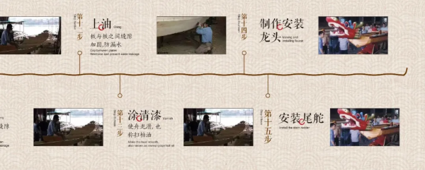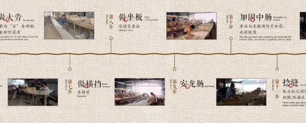 8月12日上午,3位老手艺人陈小金、吴小明、缪永根正在基地制作展示用的缩小版龙舟,一艘龙舟的完成,需要经过15道工序。
